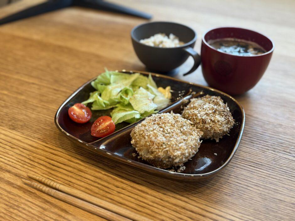 *カボチャに焼きパン粉をまぶしただけのなんちゃってコロッケ。ドレッシングはもはや買わず作らず、直接オリーブオイルと塩胡椒、マヨネーズをかけるだけになった
