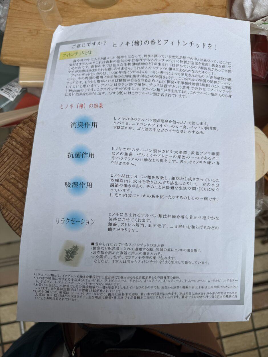 ヒノキの様々な効用も教えてくれて(写メとっておきな!と言われたので撮った)ほ〜という感じ。